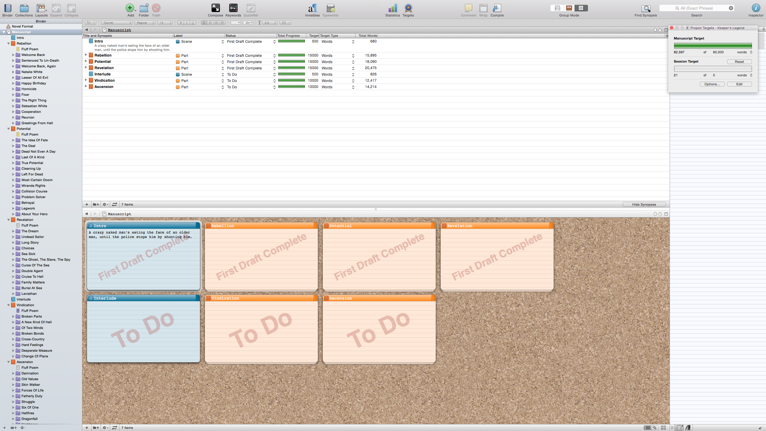 I’m knee-deep in the guts of my current work-in-progress, creatively titled “Keeper’s Legend” at the moment–a Urban (dark) Fantasy adventure-slash-thriller pitching ancient mythology against the fears and horrors of the modern times–and I thought I’d share a little bit of the progress.